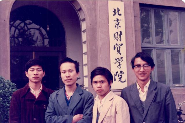 校巴把我们载到宿舍楼,安顿好后,蔡老师带我们徒步去看学校。我当时还纳闷,为什么从学生宿舍去学校要走过校外居民区?走了几百米,经过一个拐角,一幢四层大楼映入眼帘。大楼正中间有两个拱形门入口,拱门右侧墙壁竖挂着“北京财贸学院”的木牌子。穿过拱门来到大楼后面是一片操场,有几块标准篮球场,大楼对面是一排两层的行政管理楼,一层设有男女澡堂,左边是食堂。有同学问:“财贸学院就这么大吗?”蔡老师说:“是的。”我们的心顿时凉了半截:大学面积就这么大?还不如我们中学呢!