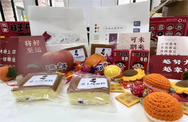 临近考研冲刺阶段,为了鼓励考研学子们坚定目标,增强迎考信心,缓解学习压力,图书馆联合起点考研数据库开展为我校考研学子送温暖活动。内容包括:精心设计暖心寄语贺卡、加油大礼包(饮品、水果、甜点、水杯、学习文具)等。