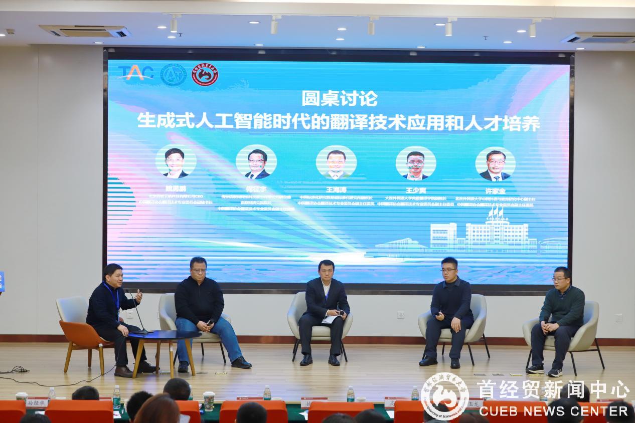 圆桌讨论环节,传神语联网网络科技股份有限公司副总裁、语联网研究院院长何征宇,中国标准化研究院基础标准化研究所副所长王海涛,大连外国语大学高级翻译学院副院长王少爽,北京外国语大学中国外语与教育研究中心副主任许家金围绕生成式人工智能时代的翻译技术应用和人才培养进行了探讨交流。本环节由北京语智云帆科技有限公司CEO魏勇鹏主持。
