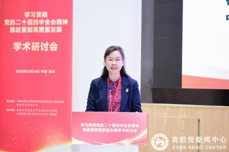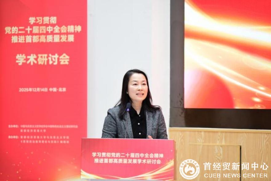 刘颖在致辞中代表学校向与会嘉宾表示了热烈欢迎和诚挚感谢。她指出,首都经济贸易大学作为北京市属重点大学,紧扣首都发展需求,在数字经济、特大城市治理、京津冀一体化建设、新质生产力等重点领域积极作为,已成为服务首都高质量发展的重要力量。刘颖强调,党的二十届四中全会为高质量发展提供了根本遵循和行动指南,学习好、研究好、阐释好、贯彻好党的二十届四中全会精神,为“十五五”时期推动首都高质量发展建言献策,是学校光荣的政治责任和学术使命。面对新时代、新形势、新要求,学校将始终坚守为党育人、为国育才初心使命,主动服务首都高质量发展大局,精准助力教育强国首善之区建设。她希望此次会议立足首都发展实际,聚焦如何运用马克思主义立场观点方法破解首都高质量发展中的重点难点问题,提出具有理论深度和实践价值的真知灼见,同时期待通过深入交流,推动马克思主义理论研究与中国式现代化、首都“四个中心”战略定位和“两区”建设更紧密结合,形成一批高质量的研究成果,为学习贯彻党的二十届四中全会精神提供理论支撑,为首都率先基本实现社会主义现代化贡献思想力量。